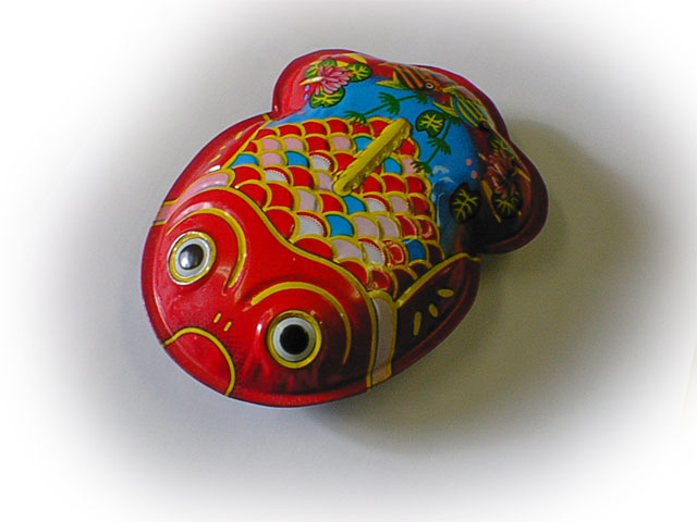ブリキの金魚には、その形や彩色だけでなく、水草や他の魚まで描きこんであって、「リアル」の全く対極だ。 どんな人がこんなデザインを考えたんだろう・・・
