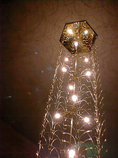 天井には明り取りの穴が開いていて、ガラス越しに青空が見える。 ホールに入る前、ビルのガラスの壁面に映る空と雲が綺麗だったので、思わず夫婦でデジカメで撮った、その青空だ。 (派手な服でも着ていたら、林家ぺーとパー子みたいだったかもしれない・・・)。 明り取りが天井にいくつか開いているのに屋内は不思議と暗く、おそらく夜と同じように照明が灯されていた。 ためしに玄関ホール脇の階段の天井に下がっていたシャンデリア風の照明を写してみたけれども、レンズの乱反射のせいか、怪しいブルーの光が沢山写りこんでしまった。