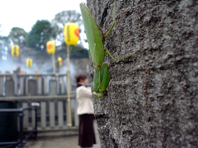 墓を巡り終えて、ふと木の幹に目をやると、カマキリが逆さになってじっとしていた。