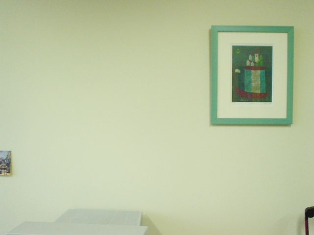 それと対照的に,この新しいビルの壁は全面が薄いクリーム色の石膏ボードなので,対面すると焦点を合わせる場所がどこにもない。 これではまるで病棟のようだというので(まあ,ホントにそんなようなものだけれど),日曜日に妻とぶらぶら絵や写真をみてまわった。 壁にかけてある絵は樋口匡子という作家のもので,まだ若い人だからだろうか,かなり手ごろなお値段だった。