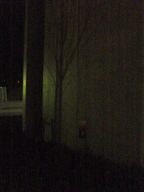 こんど入居したばかりの新しい研究棟を出て,駐車場に向かおうとしたら,コンクリートの壁に木の影が落ちていた。 昔の感覚でなんとなくデジカメを向けてはみたものの,露出調整もできないし,超小型CCDを使っているためか感度も悪くて,画面はほとんど真っ暗だ。