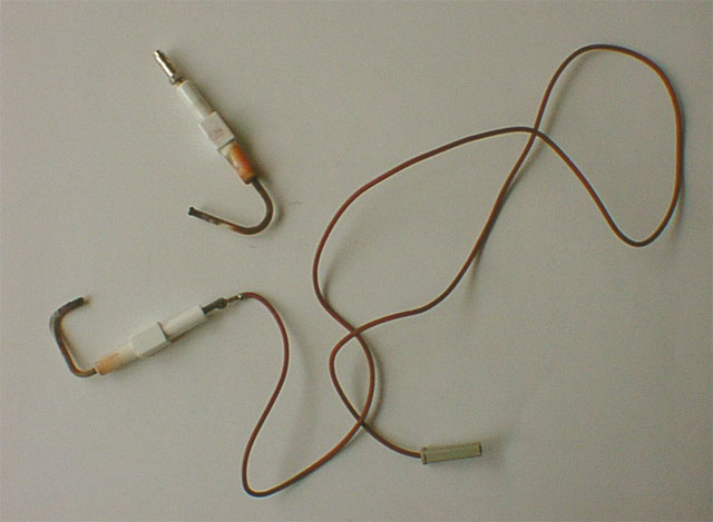 郵便受けには交換した部品2点とメモが残されていた。 (おそらく)コードの付いているほうがフレームセンサー、もう一方が点火プラグ。 数年間の使用の末にどちらもかなり消耗している。