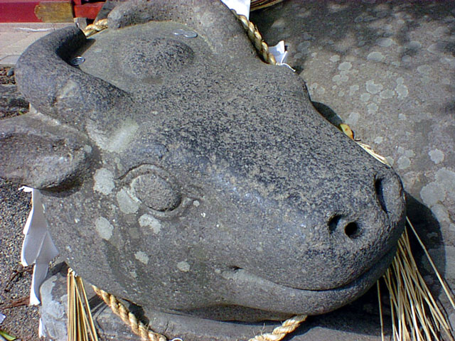 ここは歴史のある神社らしいので、あちらこちらに面白そうなモノが転がって(置かれて)いる。例えばこの牛。確か隣に縁起の書かれた看板があったと思うのだが、何が書いてあったのかは忘れてしまった。けれども、なにやら有難いモノには違いなく、鼻のところには随分と摩られた痕があるし、頭の上にはお金までのせられている。