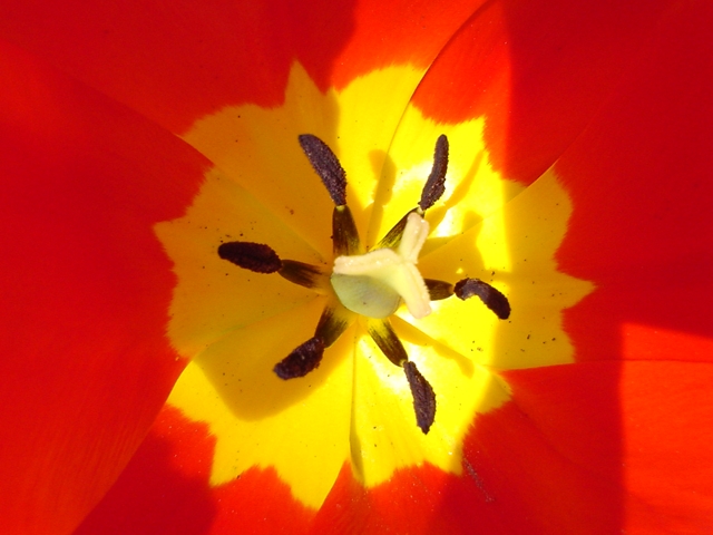 公民館の花壇には何本もチューリップが植えられていて,大きな花が風に揺れていた。 上から花の中を見てみると,まるで万華鏡を覗いているようだった。