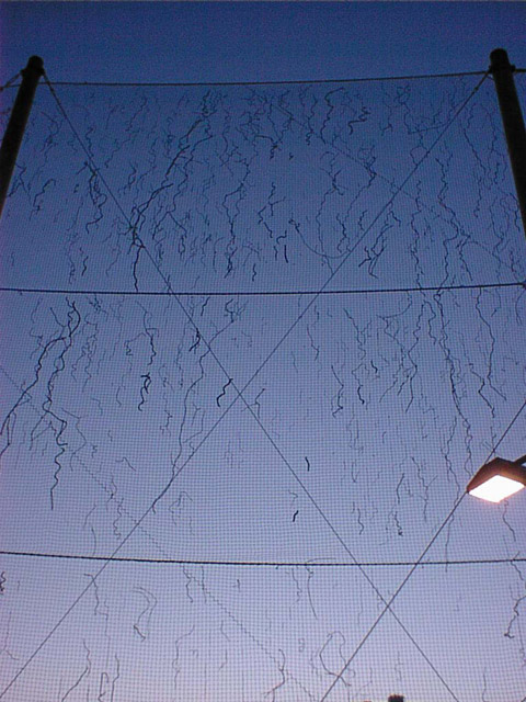 とある日曜、宮城県美術館の駐車場でふと夕空を見上げてみると、隣のテニスコートのネットに蔓草が絡んだ痕跡を見つけたので、記念写真。ネットを傷めないように蔓を切っていくのは、かなり高いところでもあり、さぞ大変だったに違いない。