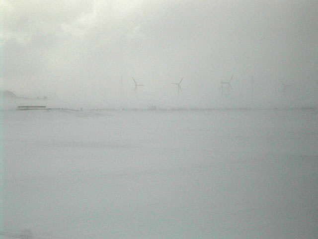 豪雪地帯の峠を越え、最上川に沿って日本海側に出る。 吹きつける西よりの強風で、積もった雪が舞い上がり、視界をさえぎる。 突然10m先も見えなくなることもある。 この辺りは地吹雪の名所らしい。 道が広くなったところでゆっくりと車を左に寄せて、助手席の妻が最上川のあちら側に見える風力発電の風車にカメラを向けた。
